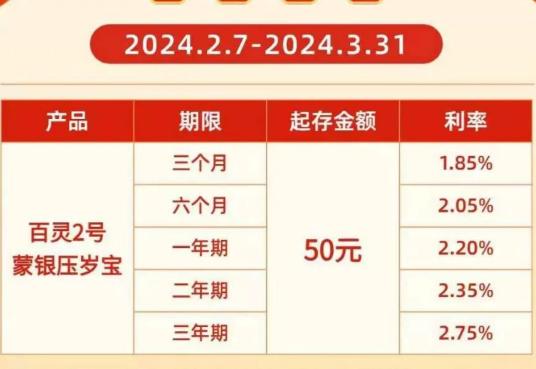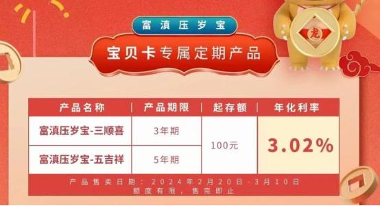 銀行卡產品方面,一些銀行推出龍年專屬萌娃定製卡,提供特色的卡面定製服務。比如工商銀行、郵儲銀行就推出了萌娃卡,可將照片印在銀行卡上。存款產品方面,多家銀行推出壓歲寶專屬定期產品。比如富滇銀行的富滇壓歲寶,年化利率達3.02%;雅安農商銀行的壓歲寶三年期利率爲3.4%;內蒙古銀行壓歲寶三年期利率爲2.75%。