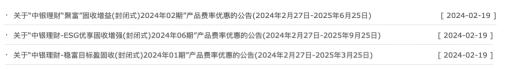 還有的理財子公司只調整了一項費率。比如中銀理財調整了三隻產品的銷售費率,由0.30%(年化)分別下調至0.20%(年化)、0.25%(年化)、0.15%(年化)。寧銀理財調整了五隻產品的固定管理費,優惠期間費率爲0.05%。