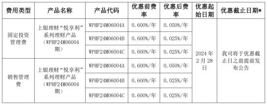 值得注意的是,上銀理財推出上述元宵節款理財產品後,便發佈公告調整相應產品的固定投資管理費及銷售管理費。根據相關公告,2月28日起,固定投資管理費及銷售管理費將由0.6%/年下調至0.05%/年或0.025%/年。