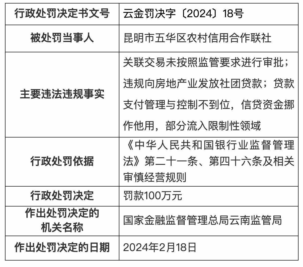 雲金罰決字〔2024〕18號顯示,昆明市五華區農村信用合作聯社被罰款100萬元。主要違法違規包括:關聯交易未按照監管要求進行審批;違規向房地產業發放社團貸款;貸款支付管理與控制不到位,信貸資金挪作他用,部分流入限制性領域。