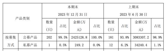 從市場整體而言,《中國銀行業理財市場年度報告(2023年)》顯示,截至 2023 年末,理財子公司的固定收益類產品存續規模爲21.87萬億元,佔比達97.33%,較年初增加1.74個百分點;混合類產品存續規模爲0.52萬億元,佔比爲2.31%,較年初減少1.83個百分點;權益類產品存續規模未發生變化。