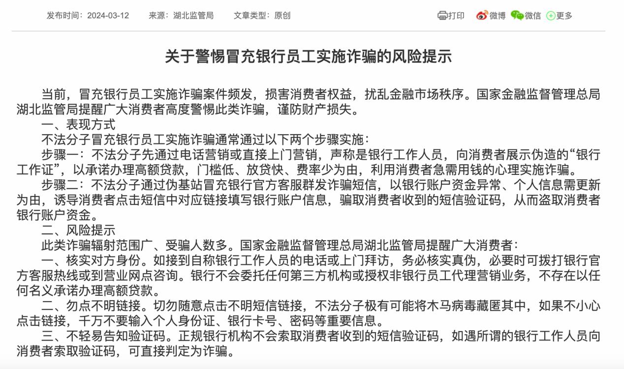 此外,針對冒充銀行員工實施詐騙,國家金融監督管理總局湖北監管局發佈風險提示,詳細介紹了相關詐騙步驟。不法分子冒充銀行員工實施詐騙通常通過以下兩個步驟實施:一是先通過電話營銷或直接上門營銷,聲稱是銀行工作人員,向消費者展示僞造的“銀行工作證”,以承諾辦理高額貸款,門檻低、放貸快、費率少爲由,利用消費者急需用錢的心理實施詐騙。二是通過僞基站冒充銀行官方客服羣發詐騙短信,以銀行賬戶資金異常、個人信息需更新爲由,誘導消費者點擊短信中對應鏈接填寫銀行賬戶信息,騙取消費者收到的短信驗證碼,從而盜取消費者銀行賬戶資金。