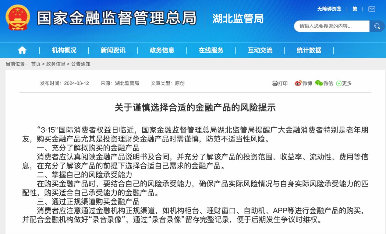 關於購買金融產品,國家金融監督管理總局湖北監管局也發佈風險提示,提醒消費者應認真閱讀金融產品說明書及合同,並充分了解該產品的投資範圍、收益率、流動性、費用等信息,在充分了解該產品的前提下選擇適合自己需求的金融產品。在購買金融產品時,要結合自己的風險承受能力,確保產品實際風險情況與自身實際風險承受能力的匹配性,購買適合自己承受能力的金融產品。