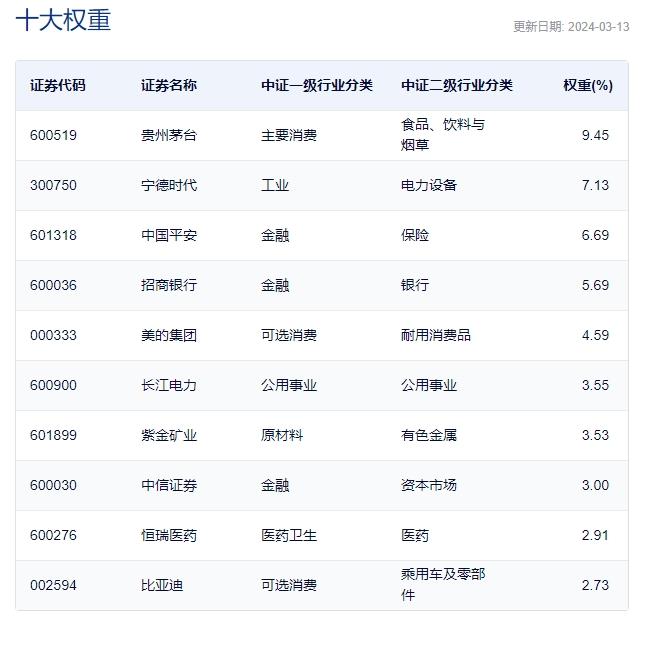 在指數編制方面,中證A50指數還突破性引入ESG可持續投資理念,將“剔除中證ESG評價結果在C及以下的上市公司證券”作爲樣本選擇考慮因素之一。最新數據顯示,中證A50指數前十大權重股依次爲貴州茅臺、寧德時代、中國平安、招商銀行、美的集團、長江電力、紫金礦業、中信證券、恆瑞醫藥、比亞迪。按照中證一級行業分類,這些股票涉及領域有主要消費、工業、金融、可選消費、公用事業、原材料、醫藥衛生。