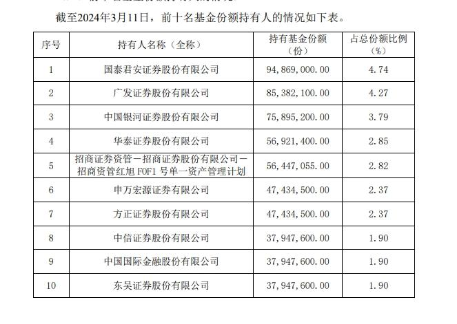 再者,華泰柏瑞中證A50ETF份額持有人結構中,截至3月11日,機構投資者持有份額佔比45.39%。此外,前十名份額持有人中,包括國泰君安證券、廣發證券、中國銀河證券等8家券商,還有中金公司及招商資管紅旭FOF1號單一資產管理計劃。