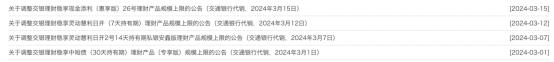 交銀理財對“穩享現金添利(惠享版)26號”和“穩享靈動慧利日開(7天持有期)”募集規模上限分別調整至50億元和130億元。值得注意的是,3月初交銀理財穩享中短債(30 天持有期)理財產品(專享版)規模上限由150億元增至300億元,調整量增加150億元。