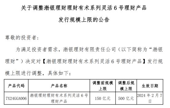 上個月還有農銀理財、渤銀理財調整了部分產品的規模上限。其中,渤銀理財“理財有術系列靈活6號”規模上限調整至500億元,調整前規模上限爲150億元,增加量爲350億元。農銀理財將“農銀時時付”6號開放式人民幣產品規模上限由300億元上調至400億元。“農銀時時付”8 號開放式人民幣理財產品規模上限由300億元上調至500億元。