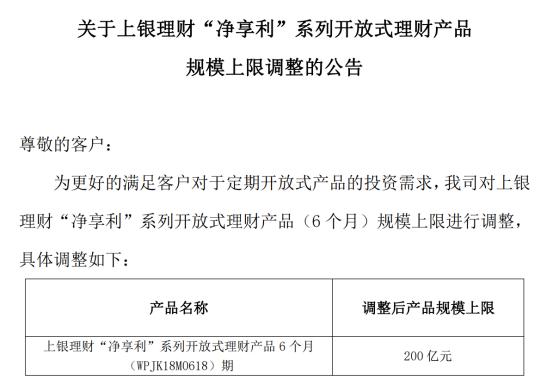 多家理財公司在調整公告中指出,爲滿足客戶投資需要對產品規模上限進行調整。據上銀理財公告,其將“淨享利”系列開放式理財產品(6個月)規模上限調整至200億元,該系列產品曾於2023年9月將產品規模上限調整至120億元,也就是說本次調整量增加了80億元。此外,上銀理財“淨享利”系列開放式理財產品(1年)的規模上限調整至100億元。