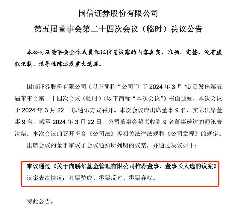 3月21日晚間,國信證券公告了第五屆董事會第二十四次會議(臨時)決議公告,公告顯示,截至2024年3月22日,公司董事會祕書收到9名董事送達的通訊表決票。9名董事全票贊成,審議通過《關於向鵬華基金管理有限公司推薦董事、董事長人選的議案》。