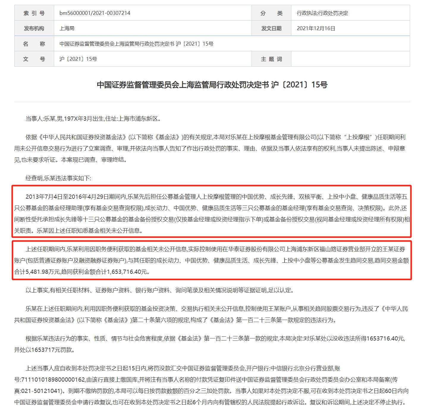 上海證監局2021年12月的行政處罰決定書顯示,樂某在擔任上投摩根基金經理期間,利用因職務便利獲取的基金未公開信息,實際控制使用王某證券賬戶,與其管理的公募基金髮生趨同交易,獲利約165萬元。然而,樂某並未吸取教訓,反而在私募期間再次進行“老鼠倉”行爲。
