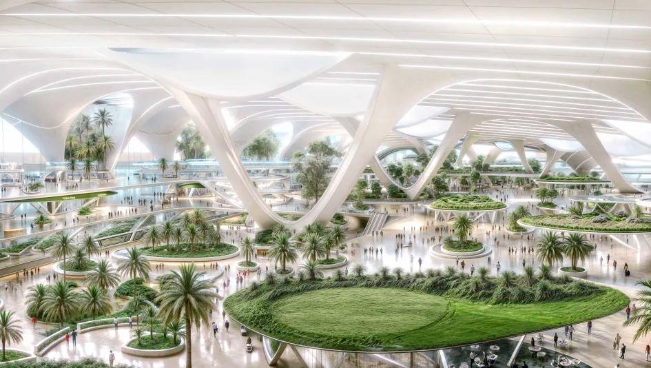新機場的設計融合了現代與傳統元素,其計算機渲染圖像展示了一座造型優雅的白色航站樓,靈感來源於阿拉伯半島傳統的貝都因帳篷。據悉,新機場將配備五條平行跑道和400個登機口,遠超現有設施。