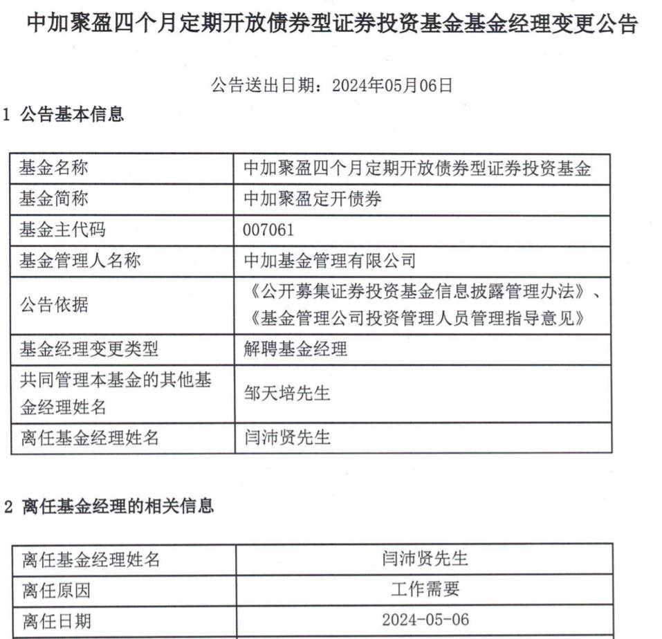 另一方面,中加聚盈四個月定期開放債券基金的基金經理有所變動。閆沛賢將不再擔任該基金的基金經理,而是由今年4月3日增聘的鄒天培獨自管理。
