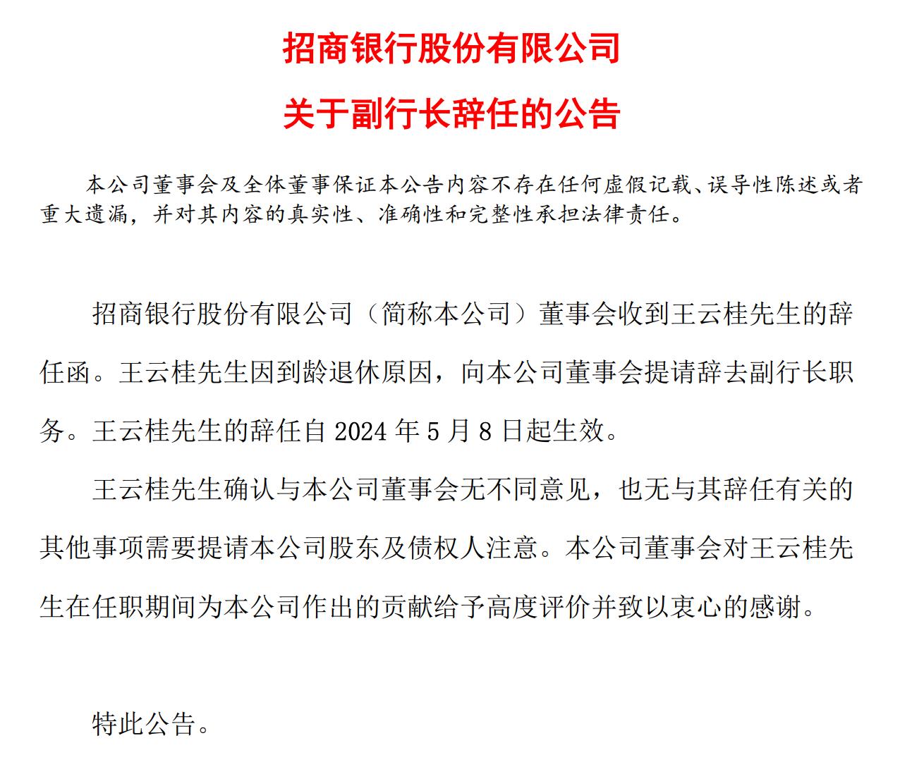 值得注意的是,5月8日,招商銀行發佈公告,該行副行長王雲桂因到齡退休原因,提請辭去副行長職務。