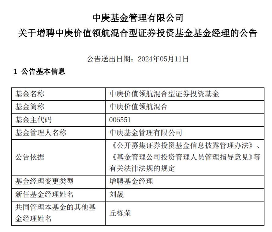 【環球網金融綜合報道】5月11日,中庚基金公告宣佈,針對旗下兩款基金產品——中庚價值品質一年持有和中庚價值領航,將分別增聘吳承根和劉晟爲基金經理,他們將與現任基金經理丘棟榮共同管理這兩款基金。