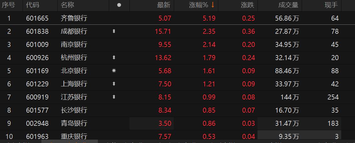 【環球網金融綜合報道】5月13日,銀行股震盪走高,截至發稿,齊魯銀行漲超5%,成都銀行、南京銀行、杭州銀行、杭州等跟漲。