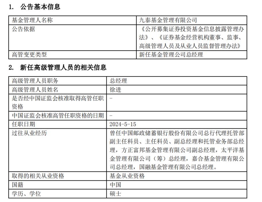 【環球網金融綜合報道】5月16日早間,九泰基金對外宣佈,徐進已正式接任公司總經理一職,履職日期爲5月15日。