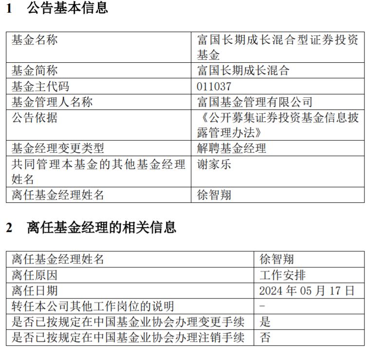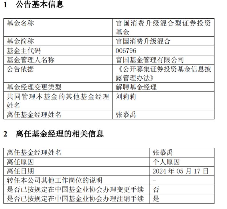 【環球網金融綜合報道】2024年5月21日,富國基金公告數據顯示,富國消費升級混合型證券投資基金(基金主代碼:011567)的基金經理張慕禹因個人原因離任,離任日期爲2024年5月17日。富國長期成長混合型證券投資基金(基金主代碼:011037)的基金經理徐智翔因工作安排原因離任,離任日期亦爲2024年5月17日。