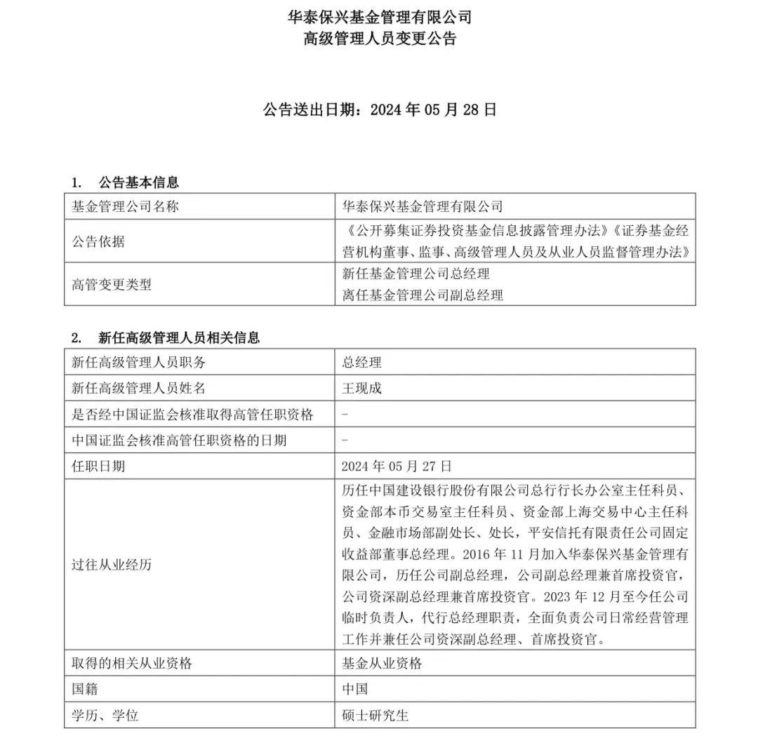 自2016年11月加入華泰保興基金管理有限公司以來,王現成先後擔任副總經理、副總經理兼首席投資官以及資深副總經理兼首席投資官等職位。去年底至今年初,他更是以臨時負責人的身份代行總經理職責,全面負責公司日常經營管理工作,併兼任資深副總經理和首席投資官。