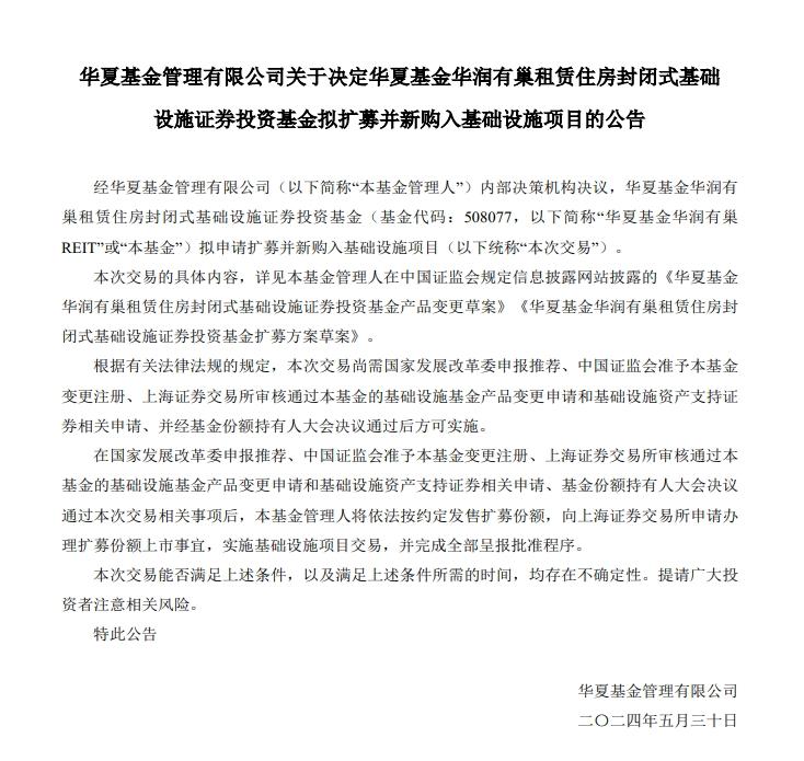【環球網金融綜合報道】5月30日,華夏基金髮布公告稱,華夏基金華潤有巢租賃住房封閉式基礎設施證券投資基金(下稱“華夏基金華潤有巢REIT”)擬申請擴募並新購入基礎設施項目。