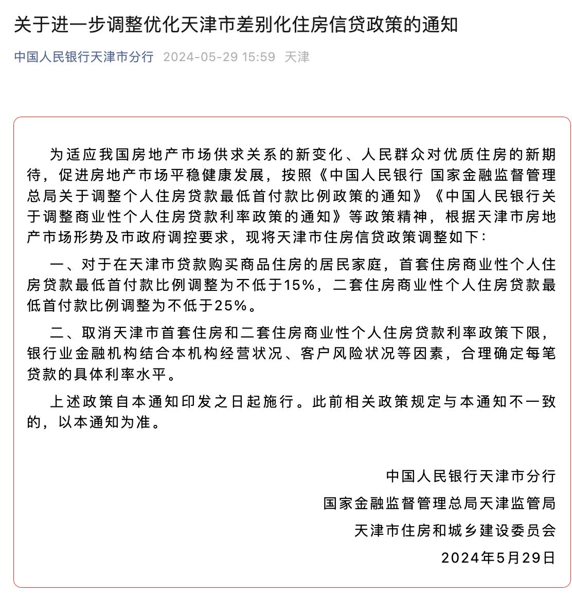 據人民銀行天津市分行,天津市住房信貸政策調整包括,一是對於在天津市貸款購買商品住房的居民家庭,首套住房商業性個人住房貸款最低首付款比例調整爲不低於15%,二套住房商業性個人住房貸款最低首付款比例調整爲不低於25%。二是取消天津市首套住房和二套住房商業性個人住房貸款利率政策下限,銀行業金融機構結合本機構經營狀況、客戶風險狀況等因素,合理確定每筆貸款的具體利率水平。