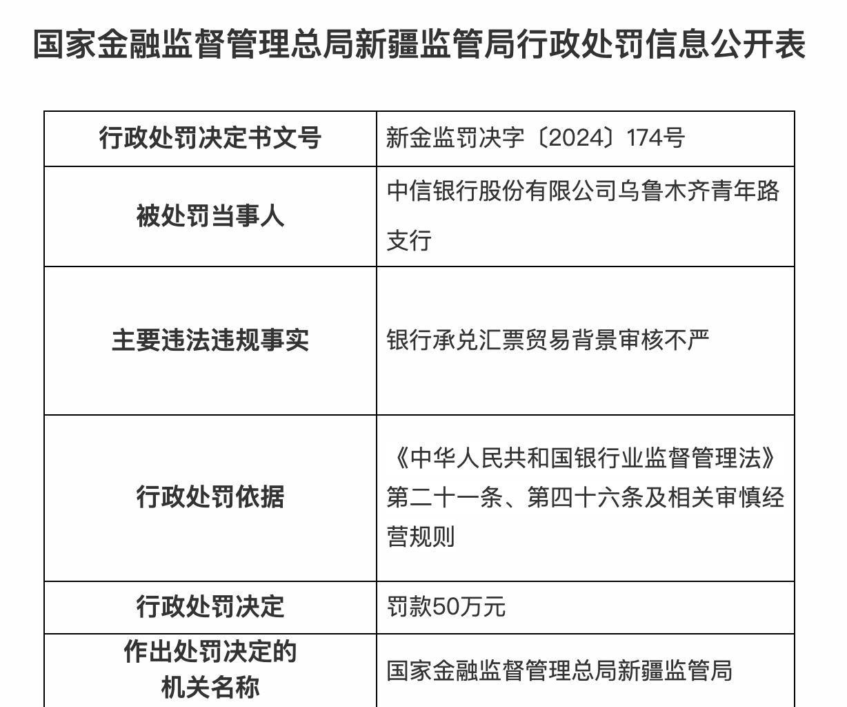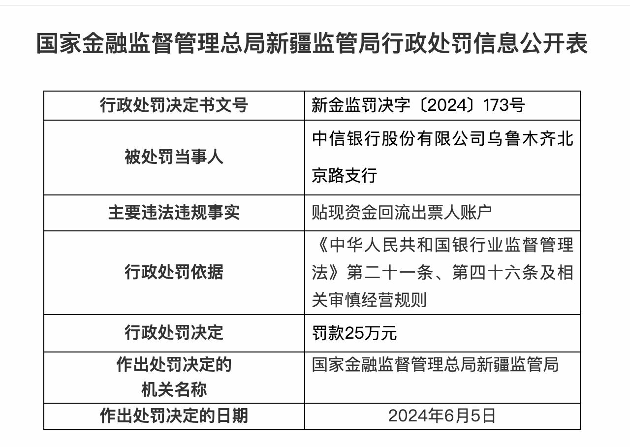 其中,中信銀行烏魯木齊南湖北路支行因貸款資金迴流至借款人,被罰款22萬元;中信銀行烏魯木齊北京路支行因貼現資金迴流出票人賬戶,被罰款25萬元;中信銀行烏魯木齊青年路支行因銀行承兌匯票貿易背景審覈不嚴,被罰款50萬元。