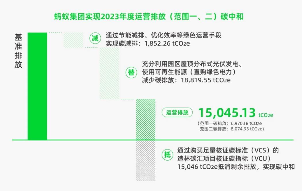 《報告》顯示:螞蟻集團持續通過“減”,即綠色建築、綠色運營等減排舉措;加上“替”,即將自運營園區90%以上的電能替換爲綠電,使2023年運營的絕對排放量較2020年下降了43.19%;再輔以“抵”,通過VCS+CCB認證的高質量森林碳匯的碳抵消,實現運營碳中和。