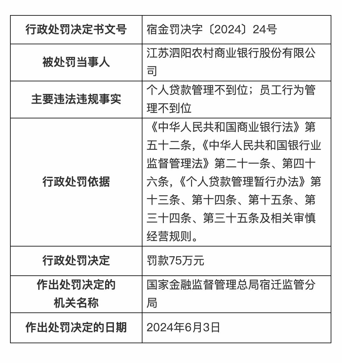 宿金罰決字〔2024〕24號顯示,江蘇泗陽農村商業銀行因個人貸款管理不到位;員工行爲管理不到位,被罰75萬元。此外,時任江蘇泗陽農村商業銀行運河支行行長被禁止從事銀行業工作終身。江蘇泗陽農村商業銀行監事長被警告並罰7萬元。