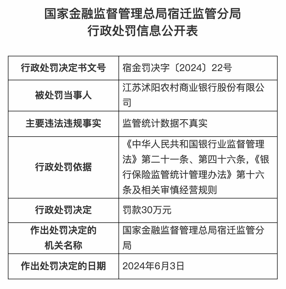另據宿金罰決字〔2024〕22號,江蘇沭陽農村商業銀行因監管統計數據不真實,被罰30萬元。此外,時任江蘇沭陽農村商業銀行信貸管理部總經理被警告罰6萬元。
