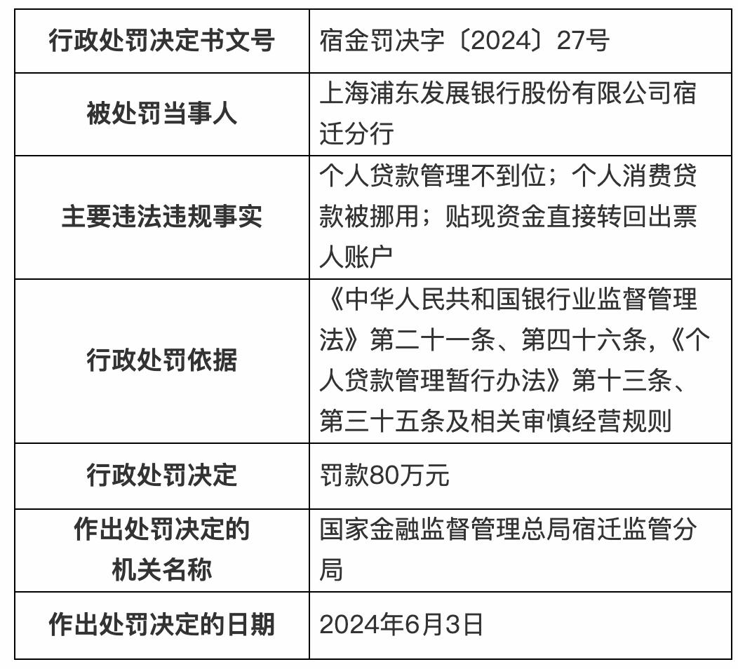據宿金罰決字〔2024〕27號,上海浦東發展銀行宿遷分行因個人貸款管理不到位;個人消費貸款被挪用;貼現資金直接轉回出票人賬戶,被罰80萬元。該分行個貸經營中心副總經理、零售業務部總經理被警告並罰6萬元。時任上海浦東發展銀行宿遷分行公司金融業務二部副總經理(主持工作)被警告並罰5萬元。
