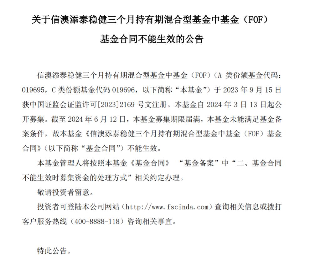 【環球網金融綜合報道】6月13日,信達澳亞基金管理有限公司發佈了一則令人關注的公告,其旗下信澳添泰穩健三個月持有期混合型基金中基金(FOF)由於未能滿足基金備案條件,基金合同宣告不能生效。