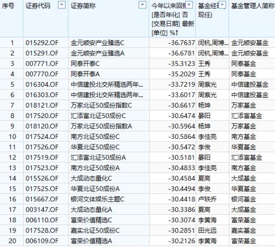 具體來看,今年以來虧損超過30%的基金共有24只,這些基金中不乏一些知名公司的產品。其中,金元順安產業臻選C、同泰開泰C、中信建投北交所精選兩年定開C等基金表現尤爲不佳,虧損幅度均超過30%。這些基金涵蓋了多個投資領域,從產業精選到主題投資。