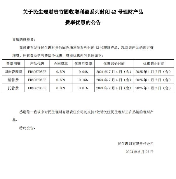 無獨有偶,今年6月,民生理財多次發佈旗下理財產品費率優惠公告。如6月27日,民生理財宣佈,對貴竹固收增利盈系列封閉43號理財產品的固定管理費、託管費及銷售費給予優惠。進一步來講,固定管理費由0.5%調整爲0.04%;銷售費由0.5%調整爲0.15%;託管費由0.03%調整爲0.01%,優惠期限從2024年7月4日(含)至2025年1月7日(含)。