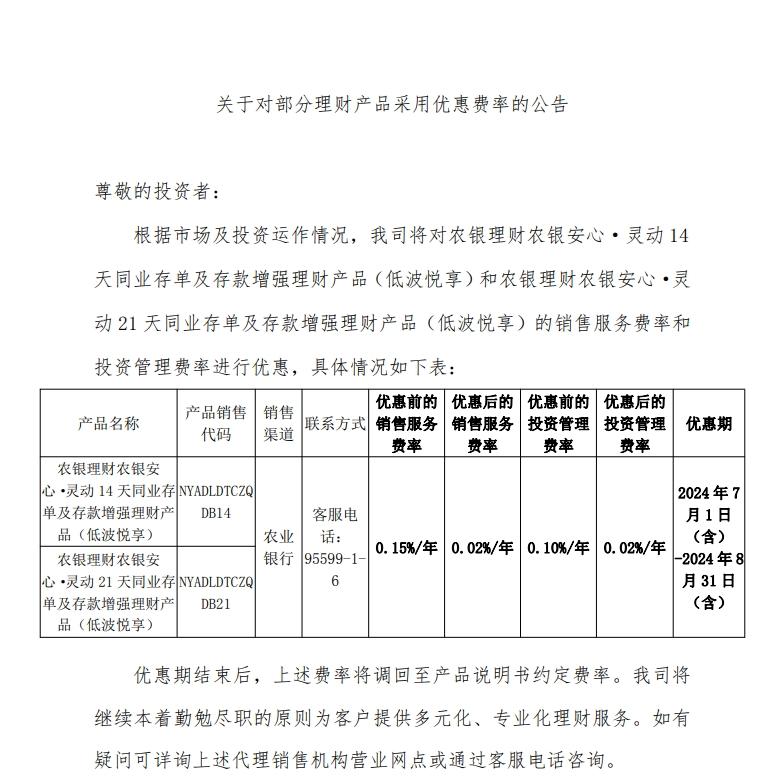 【環球網金融綜合報道】6月28日,農銀理財公告稱,根據市場及投資運作情況,將對農銀安心·靈動14天同業存單及存款增強理財產品(低波悅享)和農銀安心·靈動 21 天同業存單及存款增強理財產品(低波悅享)的銷售服務費率和投資管理費率進行優惠。