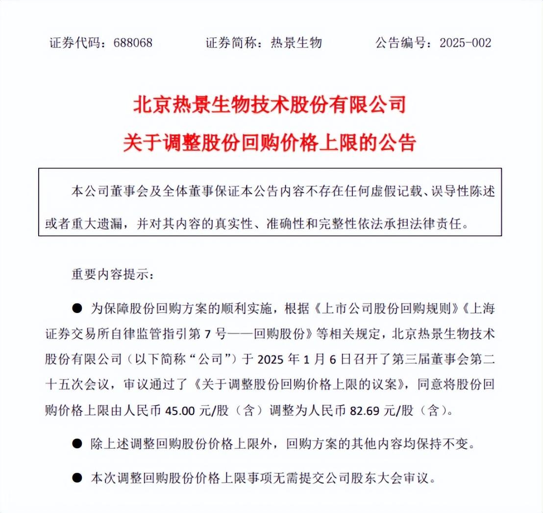 【環球網財經綜合報道】1月6日晚間,熱景生物(688068)發佈了一則重要公告,宣佈將回購股份的價格上限從原先的45元/股大幅提升至82.69元/股,調整幅度高達84%。