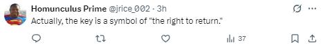 還有網友在線“科普”,“實際上,這把鑰匙象徵着‘迴歸的權利’。”“唯一危險的是你們的佔領行爲。鑰匙代表着回家。”↓