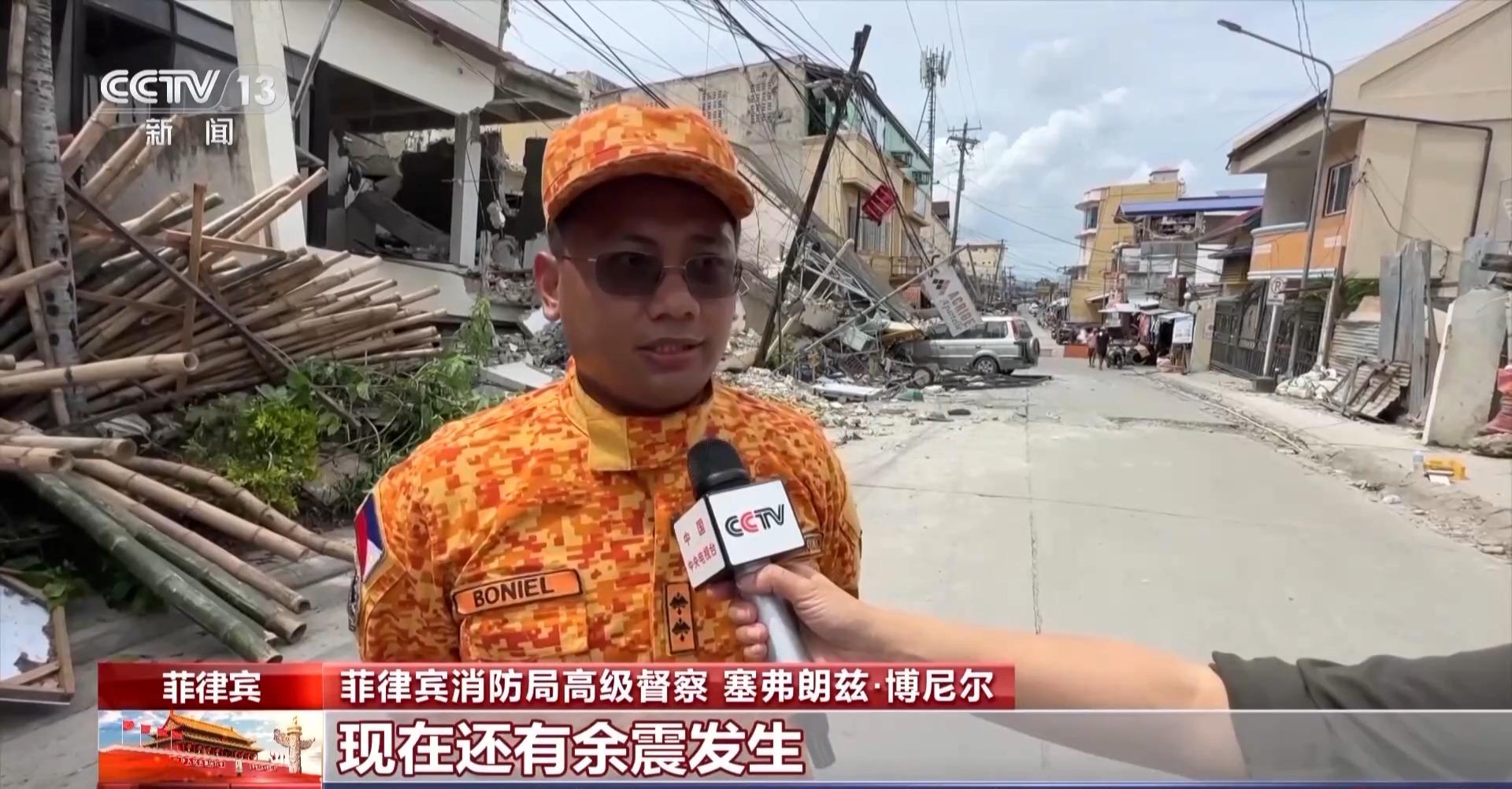 菲律賓消防局高級督察 塞弗朗茲·博尼爾:現在還有餘震發生,有時候震感強烈,所以我們消防局就在這裏確保安全。告訴人們這裏還是很危險,特別是那些店鋪的店主,我們理解他們想要取回財物,但我們還是提醒他們注意安全,也提醒路過的民衆要小心。