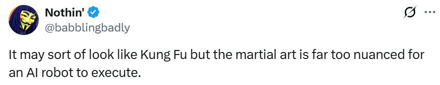 但也有網友表示,“這看起來或許有點像功夫,但武術的精妙程度遠非AI機器人所能掌握。”↓