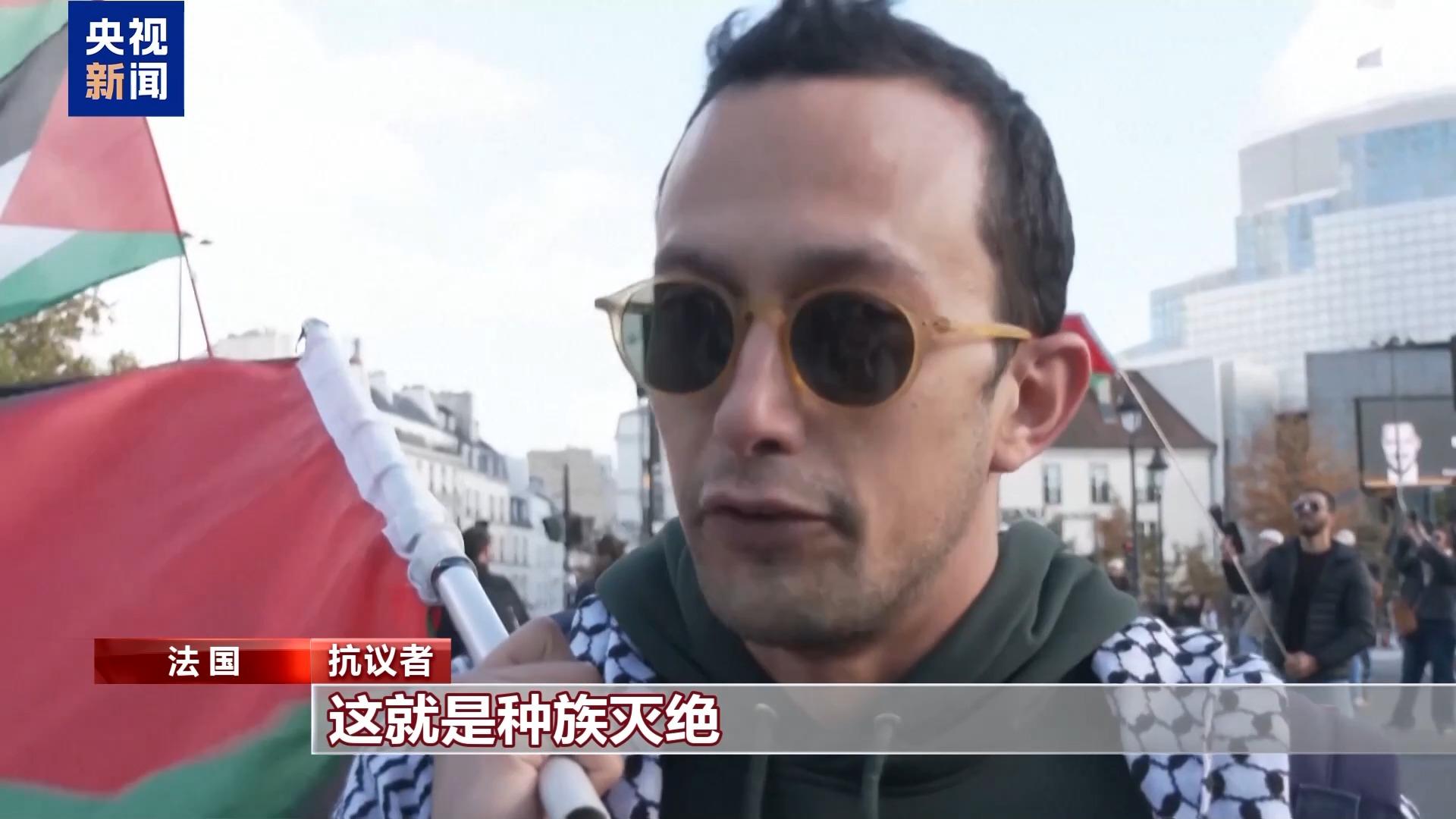 抗議者:要承認巴勒斯坦人民在自己的土地上生活的神聖權利,我在這裏遊行是爲了讓針對巴勒斯坦人民的種族滅絕能夠停止,爲了讓以色列被封鎖。以色列正犯下史無前例的罪行。