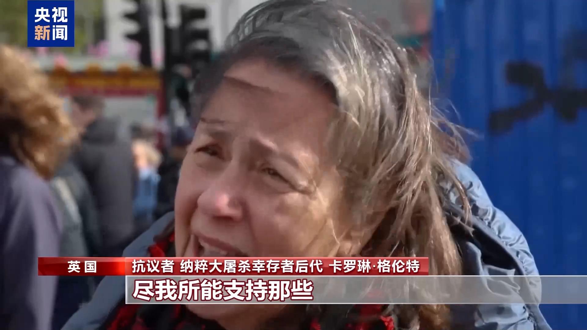 抗議者、納粹大屠殺倖存者後代 卡羅琳·格倫特:因爲我是猶太人,因爲我是納粹大屠殺倖存者的女兒,我覺得有必要來這裏,盡我所能支持那些試圖阻止這場種族滅絕的人。