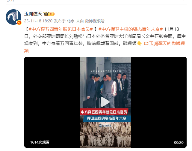 11月18日,外交部亞洲司司長劉勁松與日本外務省亞洲大洋洲局局長金井正彰會面。譚主觀察到,中方身着五四青年裝,胸前佩戴着國徽。