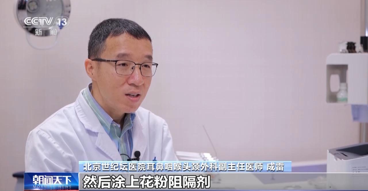 北京世紀壇醫院耳鼻咽喉頭頸外科副主任醫師 成雷:外出之前,在鼻腔先噴上鼻噴激素,然後塗上花粉阻隔劑,再戴上防花粉的口罩,眼睛如果過敏,滴一些防過敏的眼藥水,戴上一個面屏。一定不要用手去觸摸鼻子、揉眼睛,回到室內的時候,一定要先洗手,可以用生理鹽水進行鼻腔沖洗。