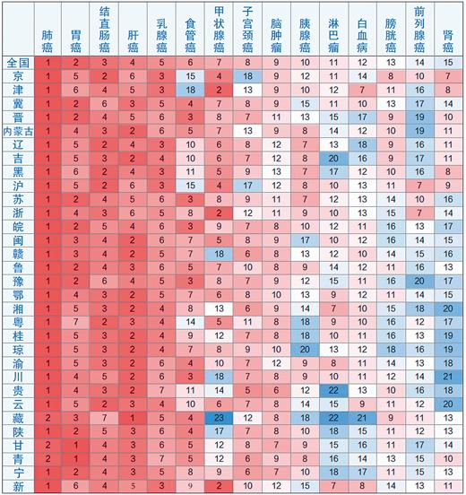 從數據統計來看,各省份主要流行的癌症有一定差異。在全國31個省(自治區、直轄市)中,肺癌發病例數在除西藏自治區、甘肅省和青海省外的其他地區均位居首位;鼻咽癌在全國惡性腫瘤發病順位中位居第20位,但在廣東省、廣西壯族自治區、海南省、江西省、貴州省均位居前10位;甲狀腺癌在全國發病位居第7位,但在天津市、浙江省、新疆維吾爾自治區上升爲第2位;食管癌在北京市、天津市、上海市、廣東省的發病例數相對較低,位居第15位左右;前列腺癌高發於社會經濟發展程度較高的地區,如北京市、上海市、江蘇省、浙江省等。