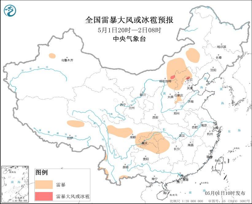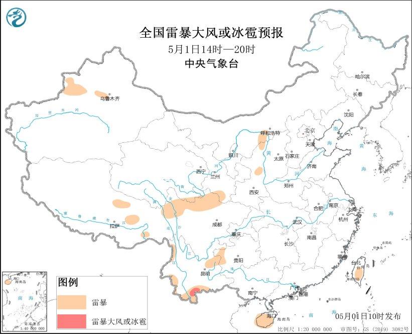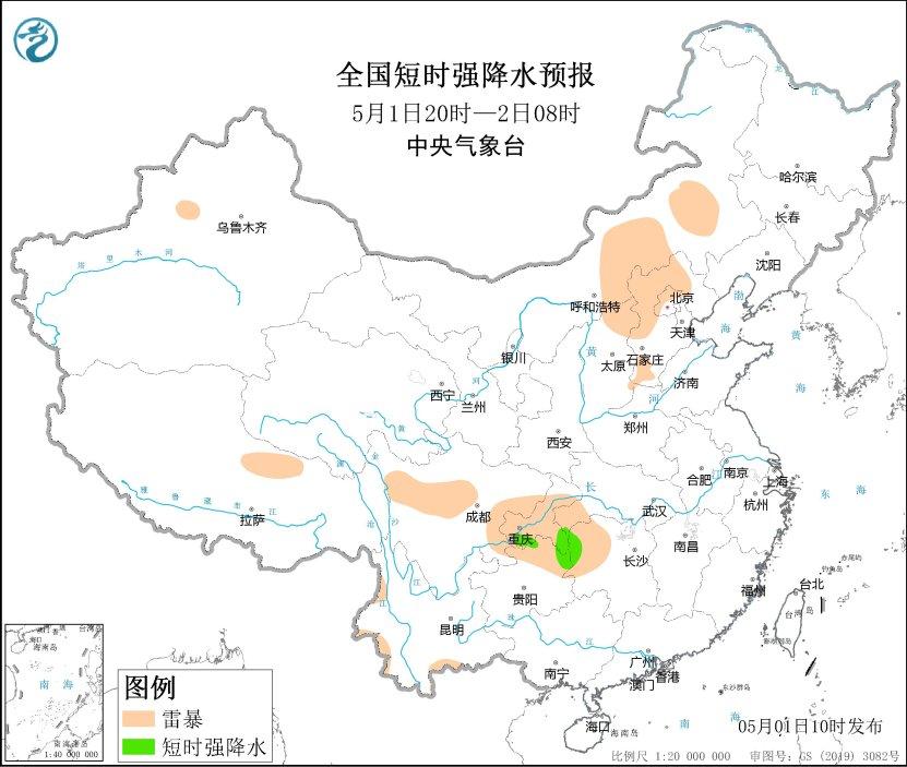 預計5月1日14時至2日08時,重慶西南部和東南部、貴州東北部、湖南西北部、雲南西南部等地的部分地區將有短時強降水天氣,小時雨量20-30毫米,局地可達40毫米以上;另外,北京東北部、雲南西南部等地的局地將有雷暴大風或冰雹天氣。