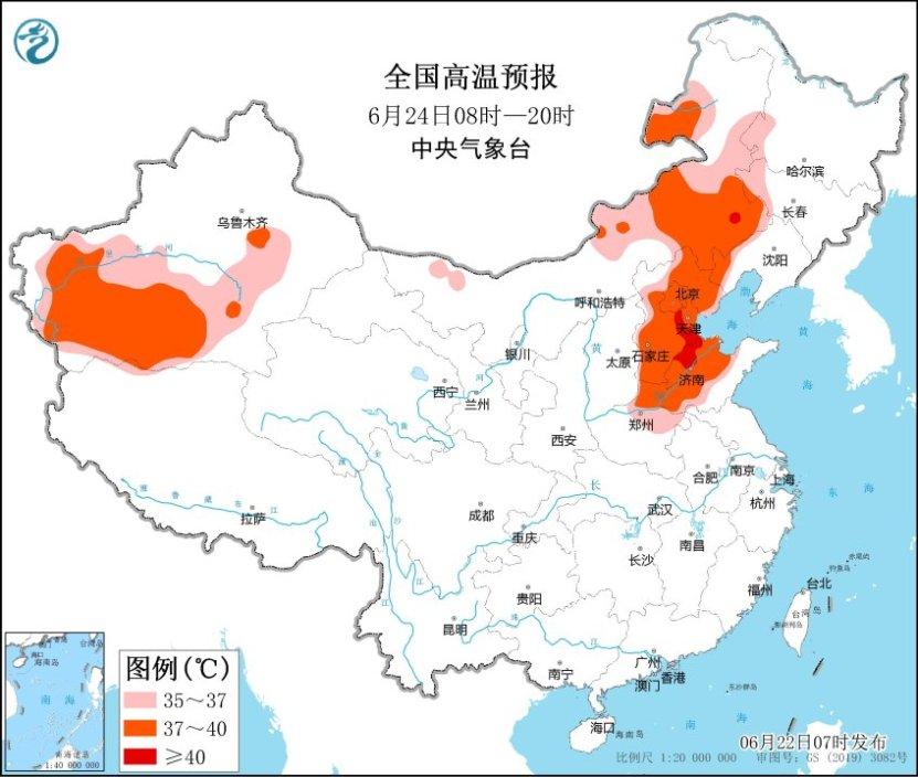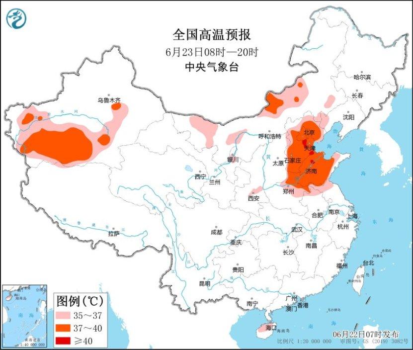 其中,今天白天,北京、天津、河北、河南北部、山東、安徽北部、江蘇北部、新疆南疆盆地和吐魯番盆地、內蒙古西部和東南部、遼寧西部等地將有35~37℃高溫天氣,其中,新疆南疆盆地、內蒙古西部、河北中南部、北京、天津、山東中西部、河南北部等地部分地區最高氣溫37~39℃,局地可達40℃以上。