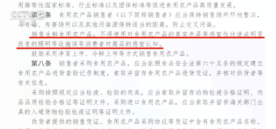 近日,國家市場監管總局修訂發佈的《食用農產品市場銷售質量安全監督管理辦法》中明確提到,銷售生鮮食用農產品,不得使用對食用農產品的真實色澤等感官性狀造成明顯改變的照明等設施誤導消費者對商品的感官認知。專家表示,使用“生鮮燈”並不代表該檔口所售賣的肉類品質一定不好,但這種燈光的確存在迷惑消費者的作用。