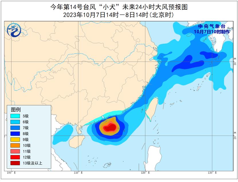 7日14時至8日14時,東海大部、臺灣海峽、南海北部、北部灣以及浙江沿海、福建沿海、廣東沿海將有6-8級、陣風9-10級的大風,其中廣東沿海、南海北部的部分海域將有9-12級、陣風13-14級的大風,“小犬”中心經過的附近海面風力有13-15級,陣風16-17級。