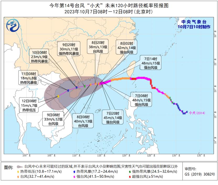 預計,“小犬”將以每小時5-10公里的速度向西偏南方向移動,強度維持或緩慢減弱,逐漸向廣東西部到海南島東部一帶沿海靠近。