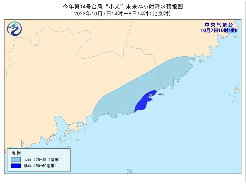 7日14時至8日14時,福建東南部、廣東東部沿海等地將有大雨或暴雨(50-60毫米)。