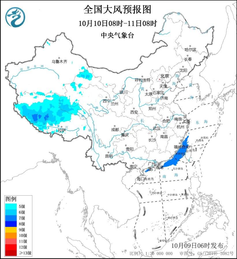 10月10日08時至11日08時,東海西南部海域、臺灣海峽、南海北部海域將有7~8級、陣風9~10級的大風;西藏西部將有5~7級、陣風8級的大風。