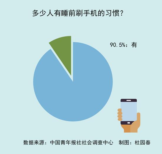 前不久,中國青年報社社會調查中心聯合問卷網(wenjuan.com),對2004名受訪者進行的一項調查顯示,90.5%的受訪者都有睡前刷手機的習慣,且男性比女性更普遍。65.5%的受訪者覺得睡前隨意翻閱喜歡的內容很愜意。但有61.7%的受訪者吐槽越刷越精神,導致入睡難。